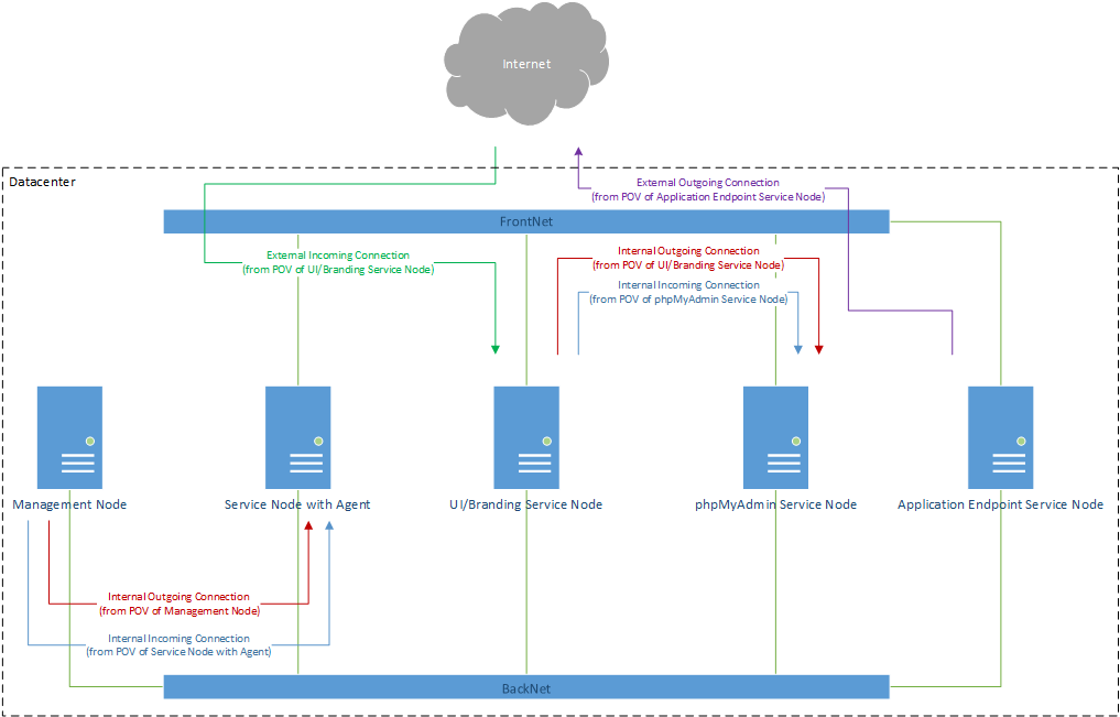 Internal means that connections of this type are merely used for communication between Odin Automation service nodes within a datacenter where Odin Automation service nodes are placed. For example: BackNet connections from the Odin Automation management node to Odin Automation agents installed on Odin Automation service nodes; FrontNet connections from branding service nodes to webmail service nodes; FrontNet connections from branding service nodes to phpMyAdmin service nodes; BackNet connections from customer websites that are placed on web service nodes to databases that are placed on database service nodes.